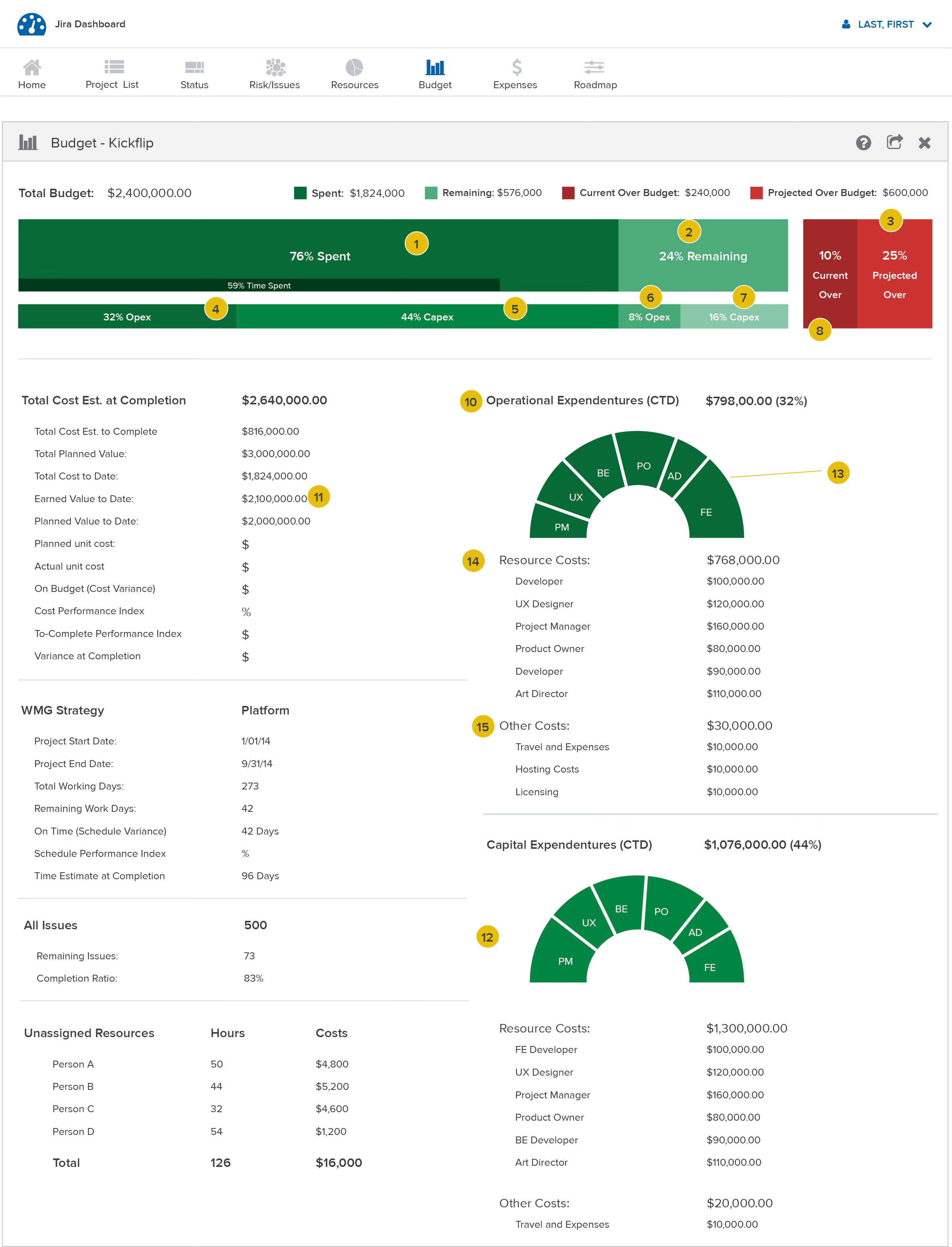 All of these individual modules pulled from the live data that were being entered in JIRA. Built solely on JOSN feeds to APIs, no backend service was ever needed to execute this dashboard.