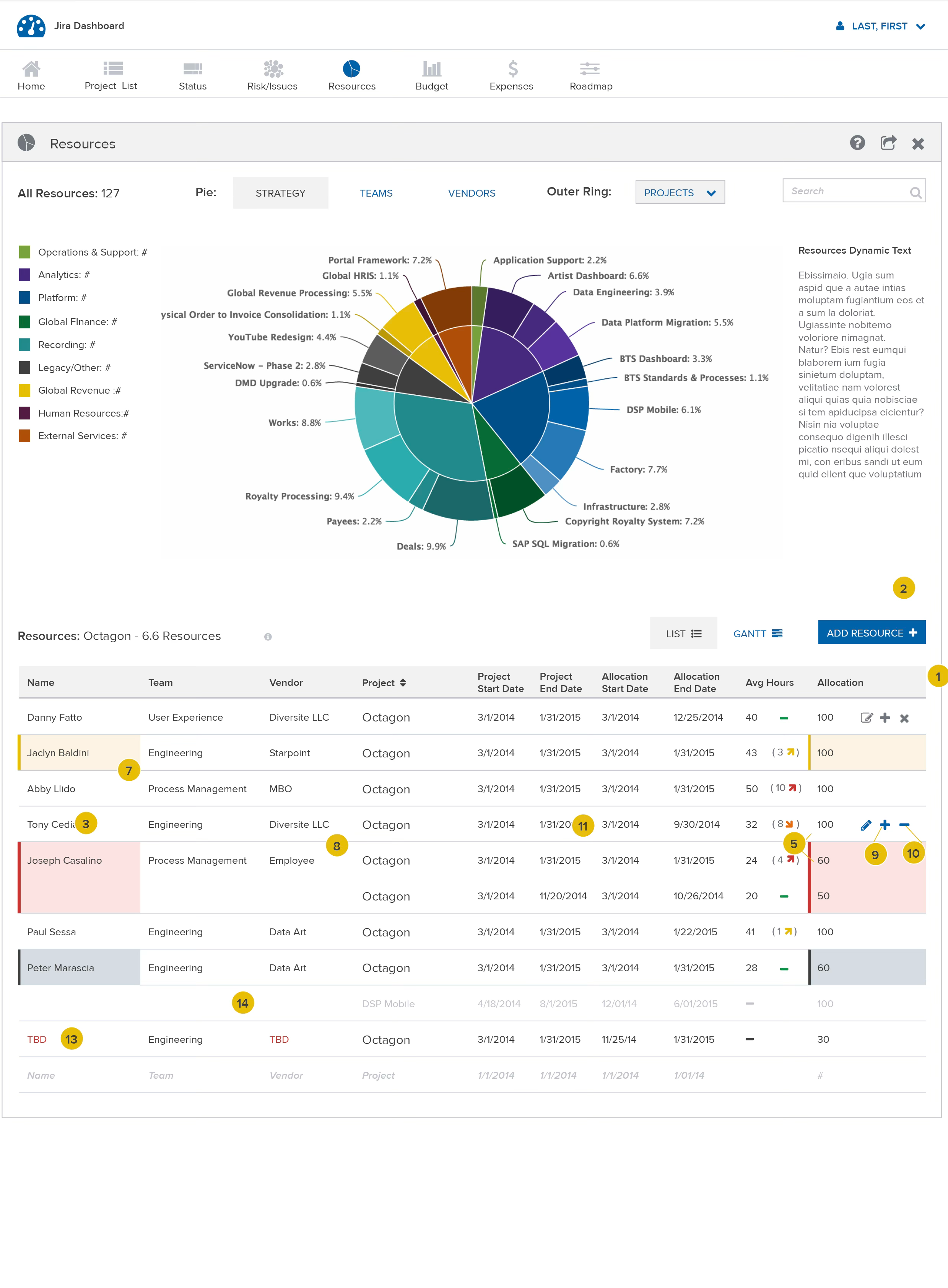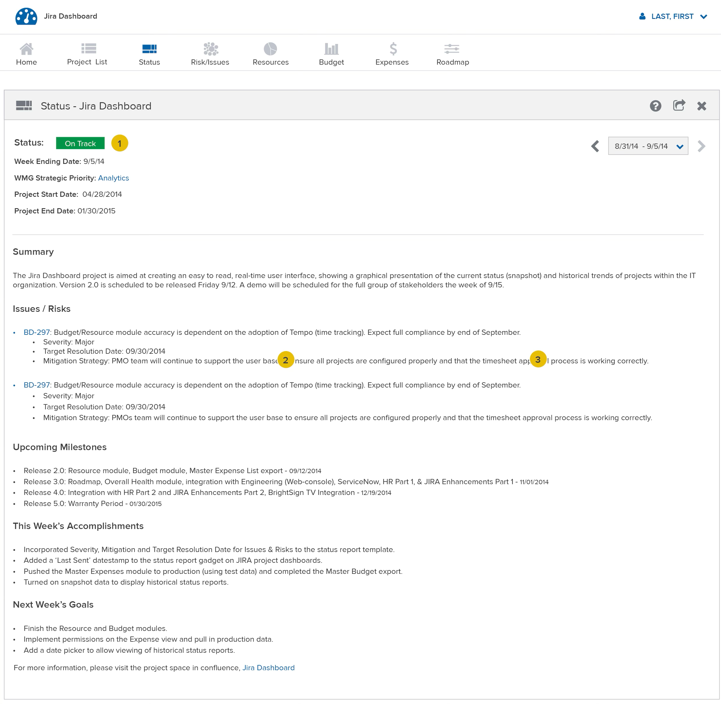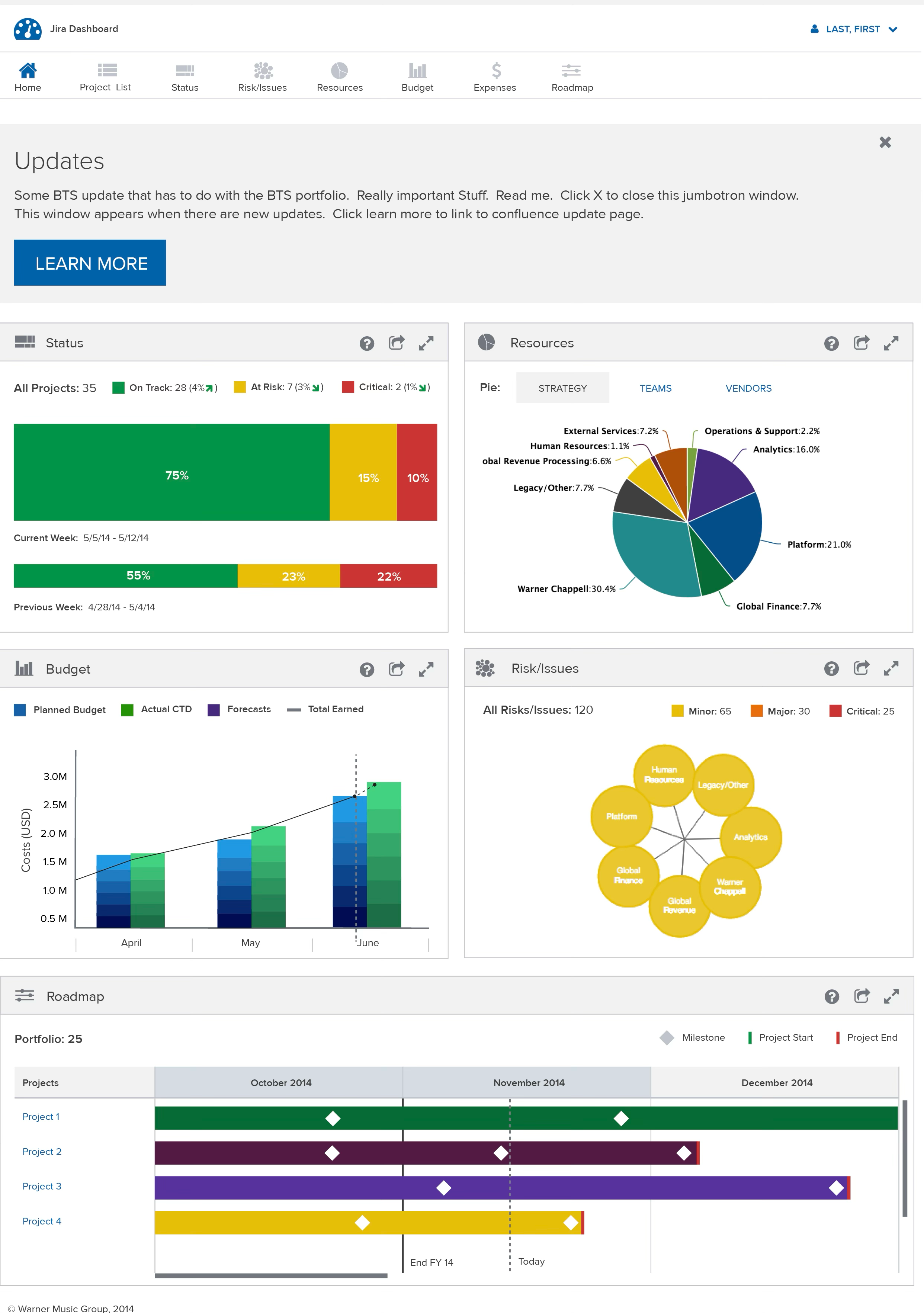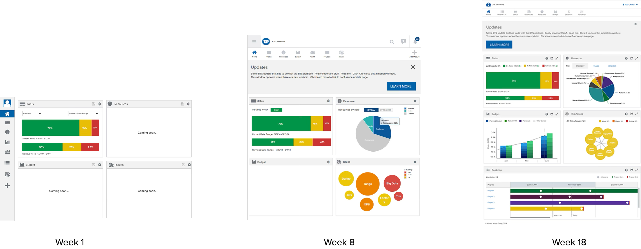 Over the course of a year, we developed 6 Modules, all with unique functionalities. There was Status, Resources, Budget, Issues & Risks, Roadmap, and a master project list that served as a project overview.